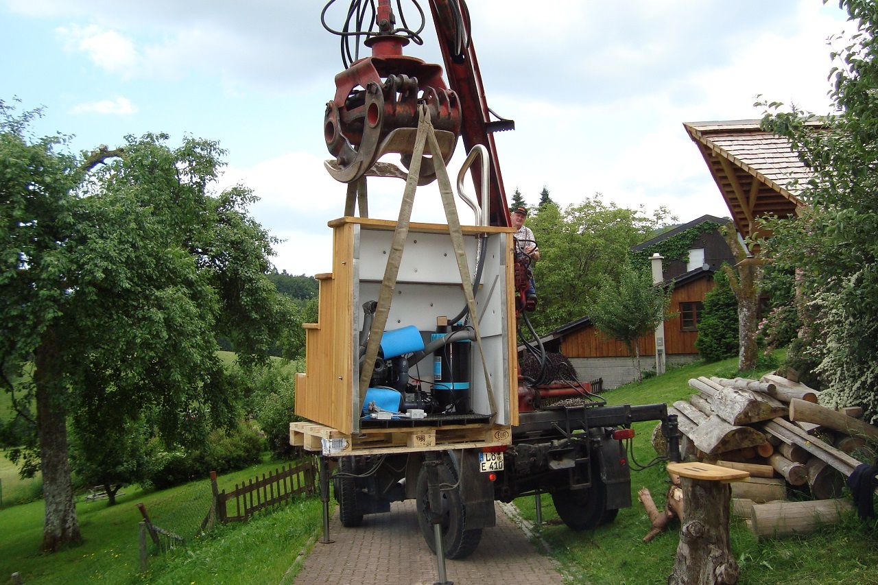 Der zweite Teil beim Abladen wird mit dem Unimog-Kran vollbracht.