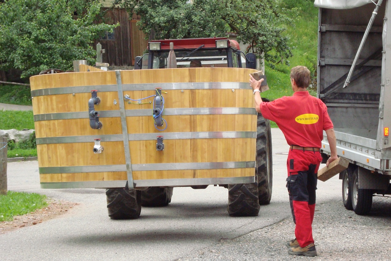 Der erste Weg zum Aufstell-Ort wird mit dem Traktor auf der Ladegabel zurückgelegt.