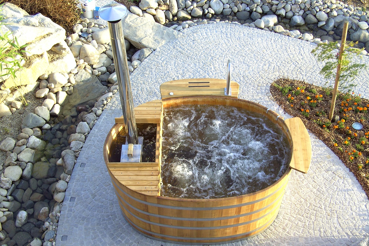 Fertigstellung des Hochwertigen Fassbinder Whirl Tub. Mit der Befüllung vor Ort wird nochmal die Dichtigkeit des Whirltubs und die Funktionstüchtigkeit des Holzofens überprüft, zudem noch die Whirlpool Düsen.