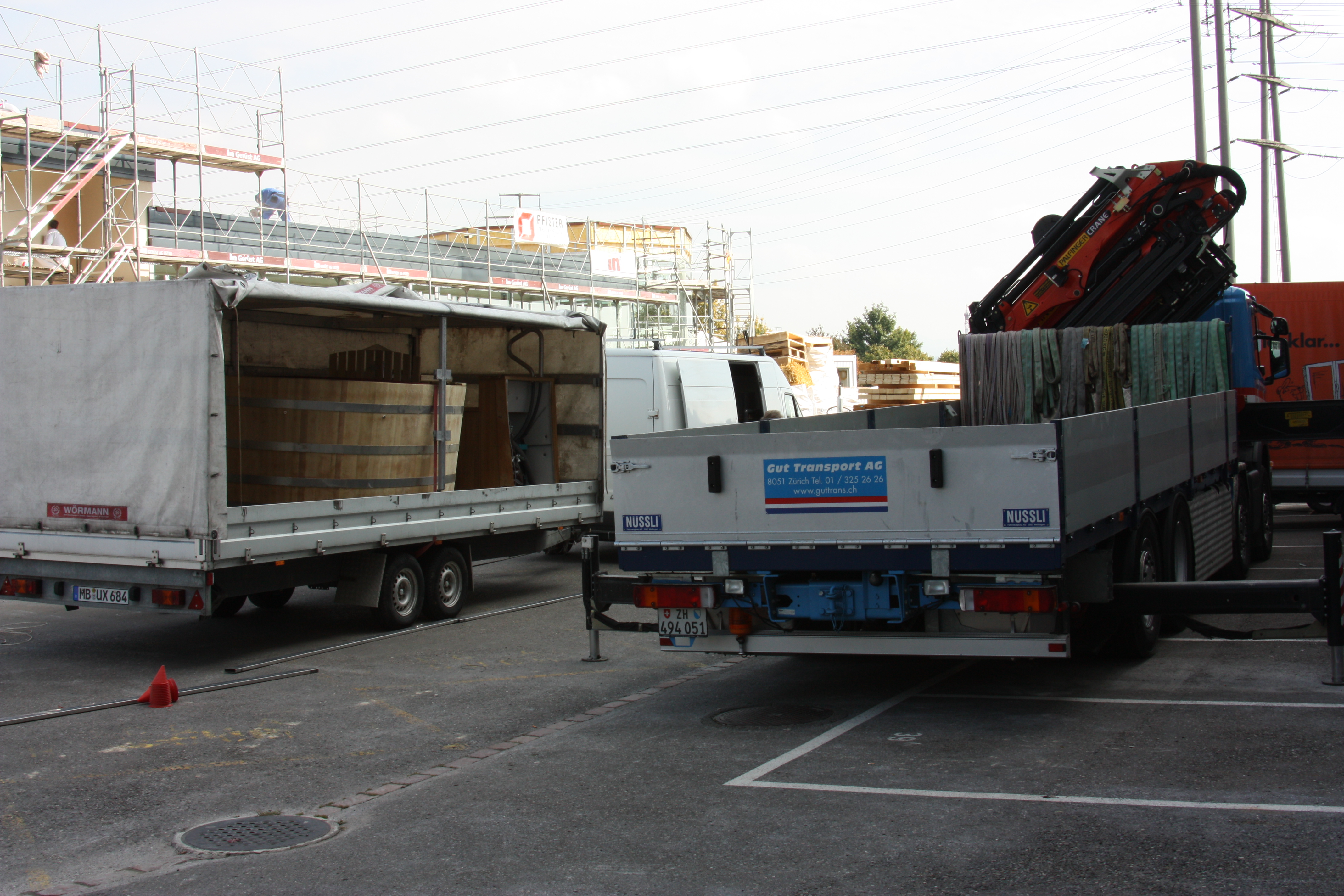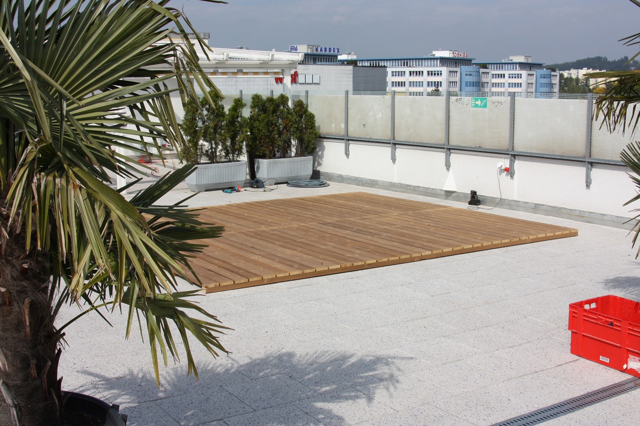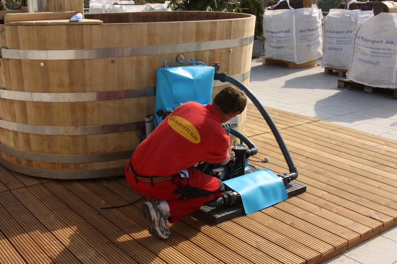Am Bestimmungsort wurde bereits der Holzuntergrund für den Jacuzzi vorbereitet.
