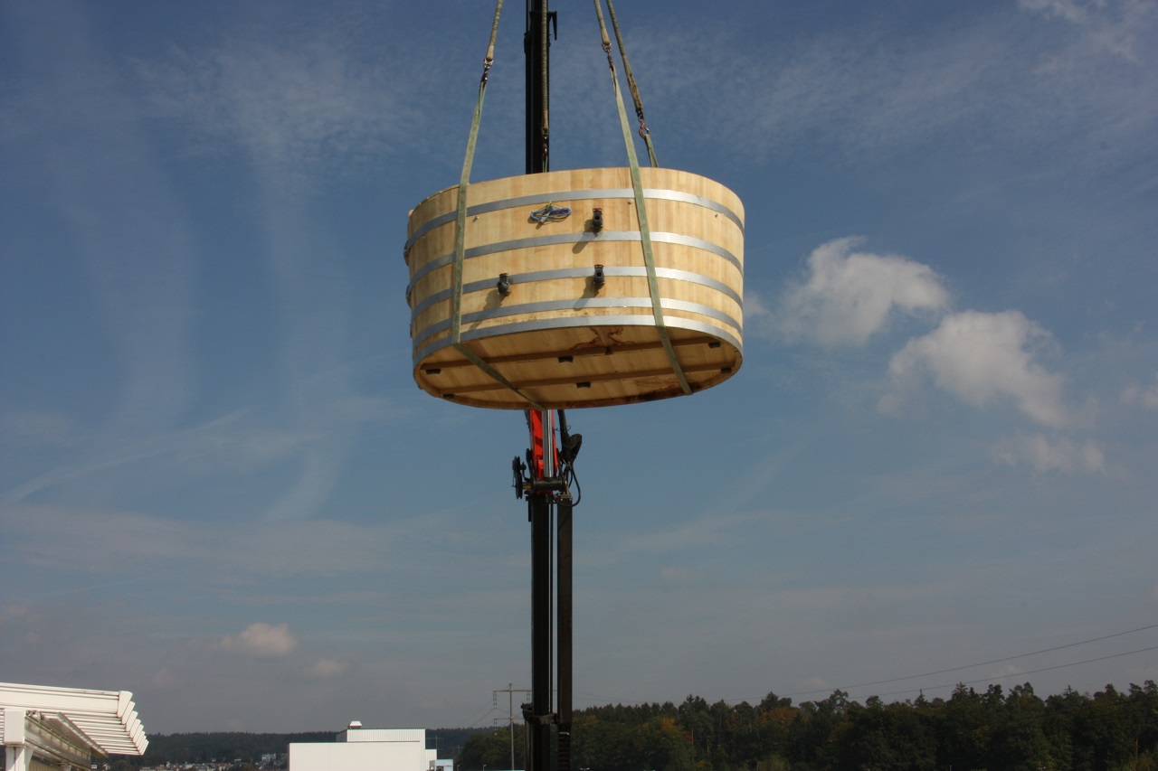 Das Hochheben mit dem riesigen Kran dauerte nur etwa 15 Minuten bis der Whirtub auf dem Dach stand.